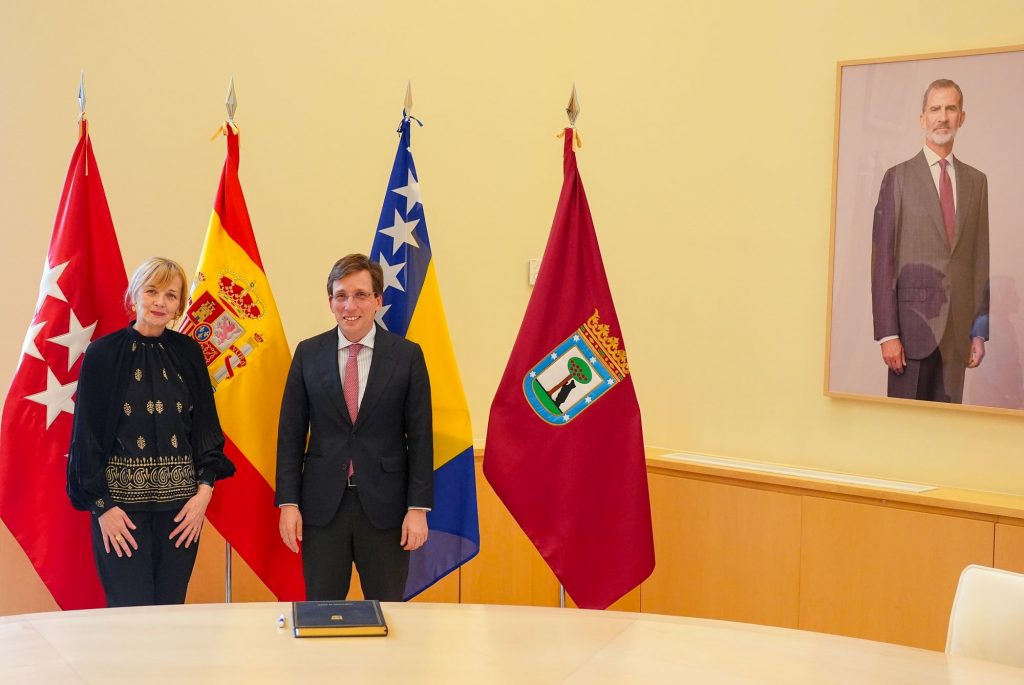 El motivo principal de esta reunión, que se desarrolló en un ambiente cálido y cordial, fue la próxima celebración del 20.º aniversario del hermanamiento entre las ciudades de Madrid y Sarajevo y un debate sobre las posibilidades de mejorar la cooperación. La Embajador transmitió al Alcalde Almeida los cordiales saludos del Alcalde de Sarajevo, Samir Avdić, y la invitación a visitar la capital de Bosnia y Herzegovina. El Sr. Almeida agradeció la visita, correspondió a los saludos y confirmó que su oficina tomará medidas para definir las posibles fechas de la misma.